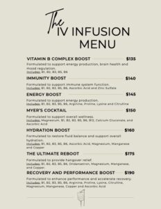 Includes Choice Of: Vitamin B Complex Boost, Immunity Boost, Energy Boost, and Myer’s Cocktail
